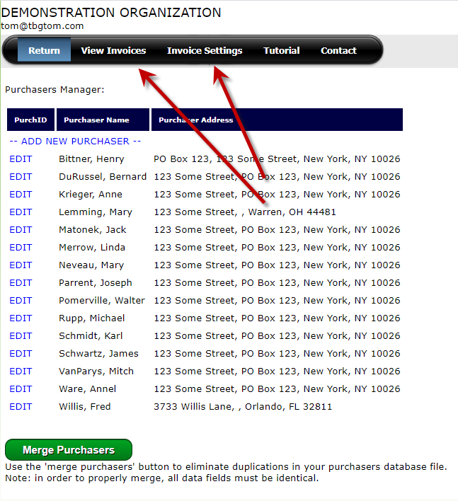 You are then taken to the View Invoices page (which is not specific to any purchaser, it lists all invoices). You can also get to this page from the main Purchasers Manager page as shown below.