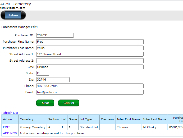 You can edit an already existing purchaser by clicking on the Purchaser Name, or you can input a new purchaser record by clicking on the Add New Purchaser link.
